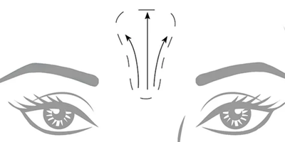 Using the flat side of the brush, apply White Contour. Sweep upward between the brows. With your middle finger, using a patting motion, blend to soften the lines of your forehead.