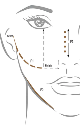 F1. CHEEKS - Using the tip of the brush, begin Brown Contour at the middle of the ear as defined in the illustration as F1. Continue dashes underneath cheek bone to just below bottom of nose and center of iris. With ring finger, pat and blend to the hollow of your cheek bone until desired results are achieved.